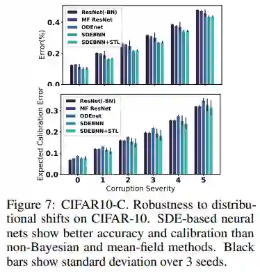 下图 7 显示了损坏测试集上相对于未损坏数据的误差,表明随着扰动严重性级别的增加以及表 1 中总结的总体误差度量,mCE 稳步增加。在 CIFAR10 和 CIFAR10-C 上,SDE-BNN 和 SDE -BNN + STL 模型实现了比基线更低的整体测试误差和更好的校准。