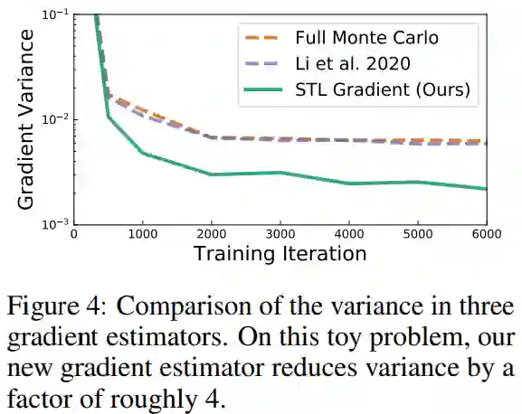 等式 (12) 中的第二项是鞅(martingale),期望值为零。在之前的工作中,研究者仅对第一项进行了蒙特卡罗估计,但该研究发现这种方法不一定会减少梯度的方差,如下图 4 所示。