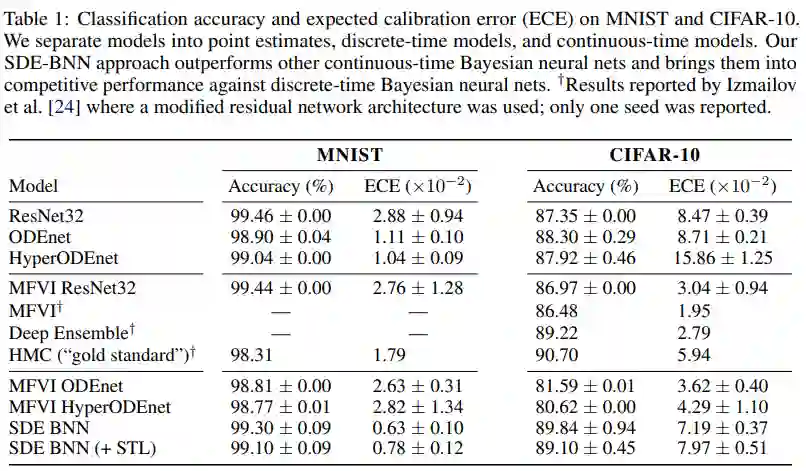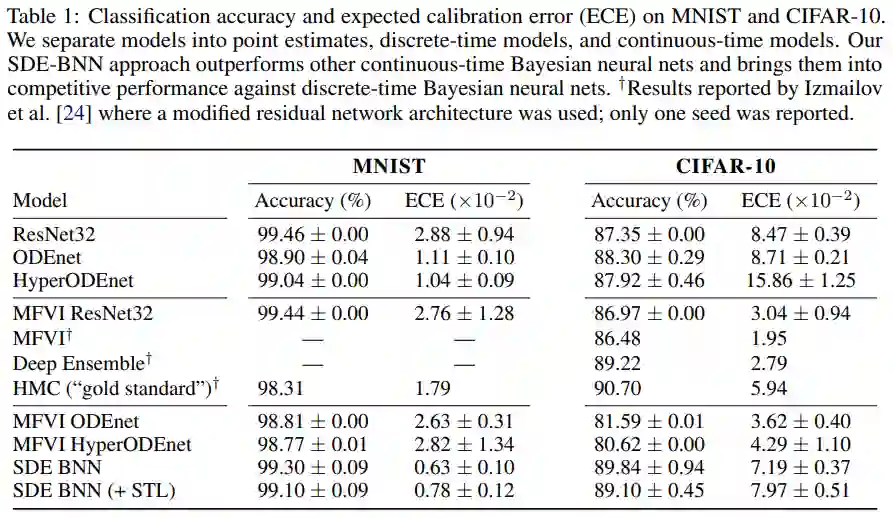 表 1 用预期校准误差量化了模型的校准。SDE-BNN 似乎比神经 ODE 和平均场 ResNet 基线能更好地校准。