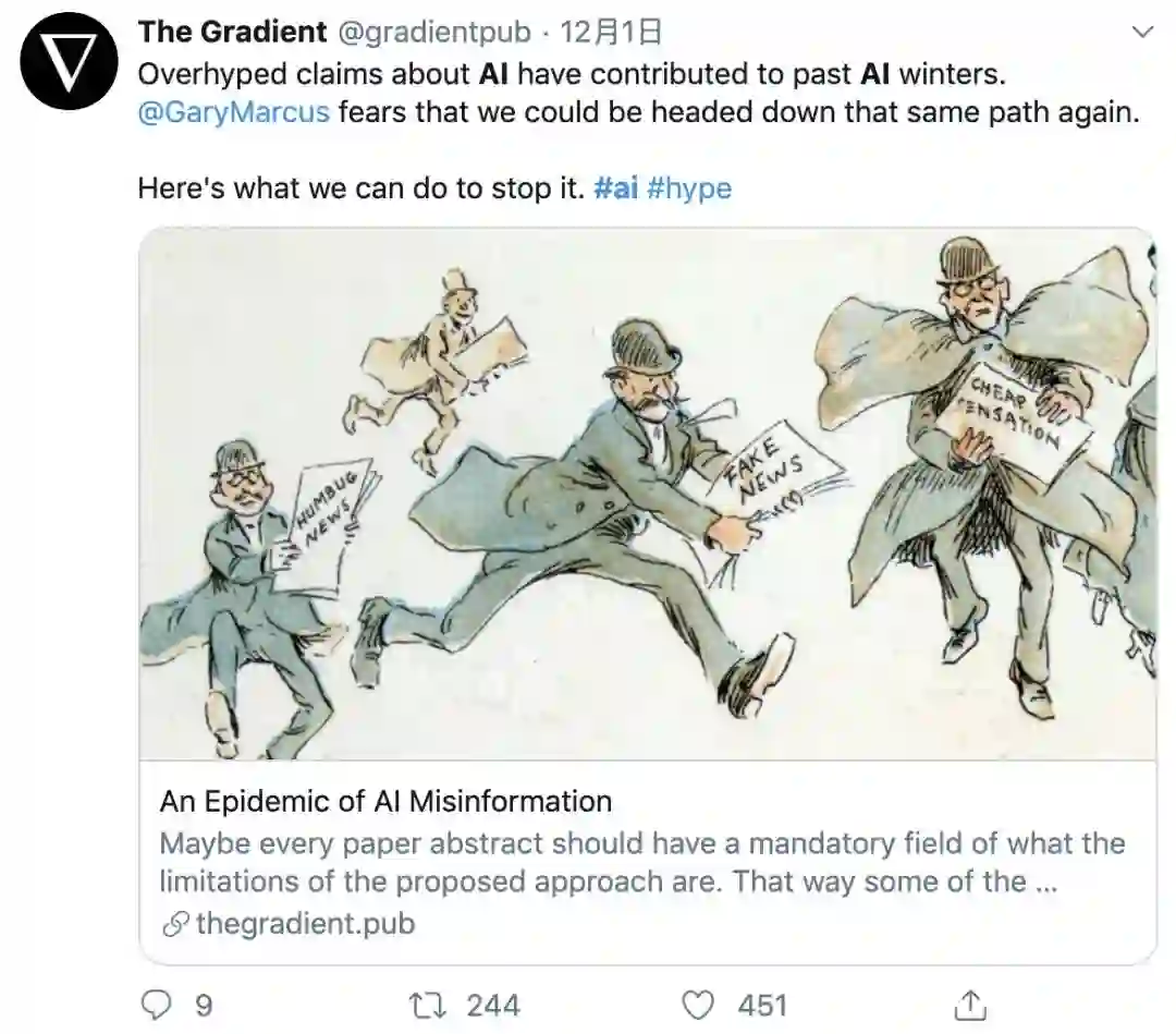 “过度的宣传和错误的信息将导致AI寒冬再来”,纽约大学心理学与认知科学教授、畅销书作家加里 · 马库斯 (Gary Marcus) 最近在The Gradient上撰文,批评媒体在报道AI进展时常常倾向于将每一个微小的新进展描述为将从根本上改变我们的世界的巨大的胜利。
