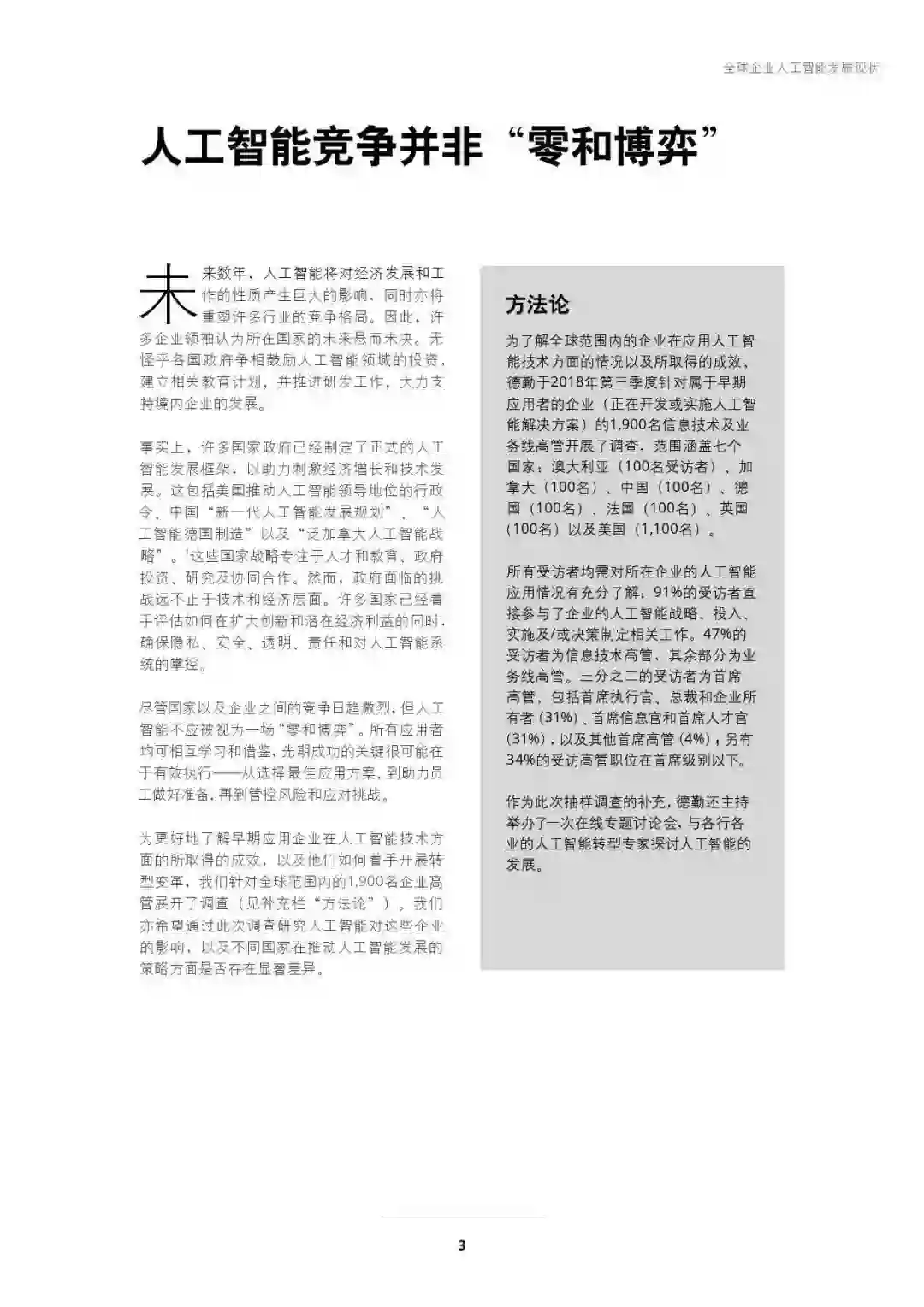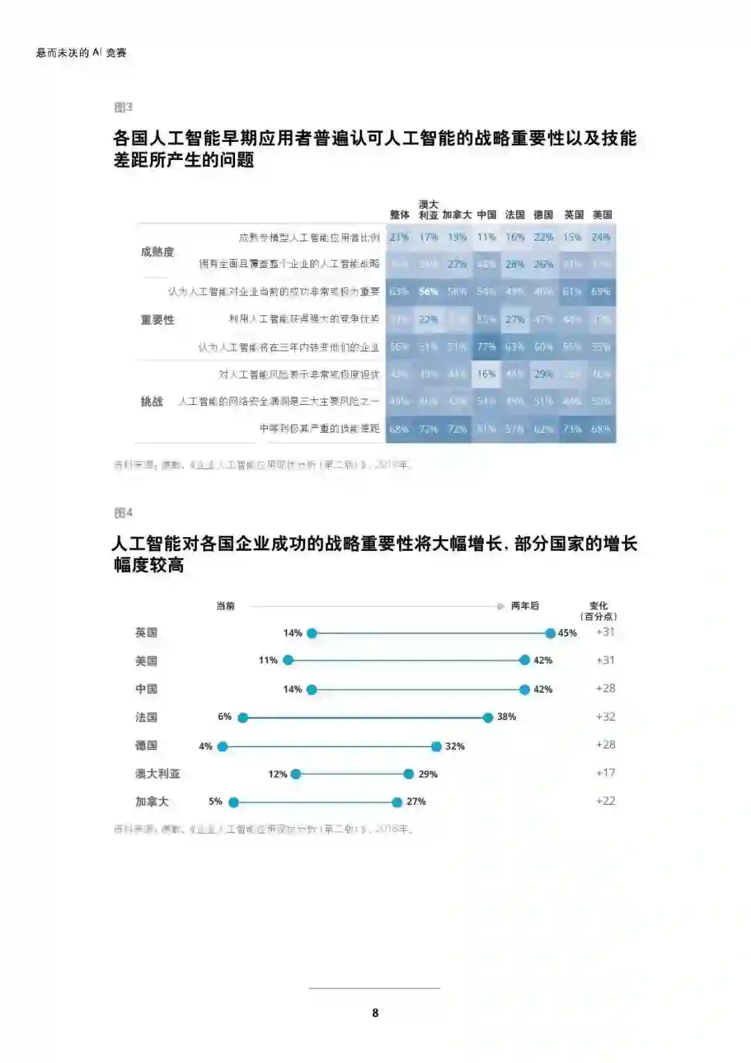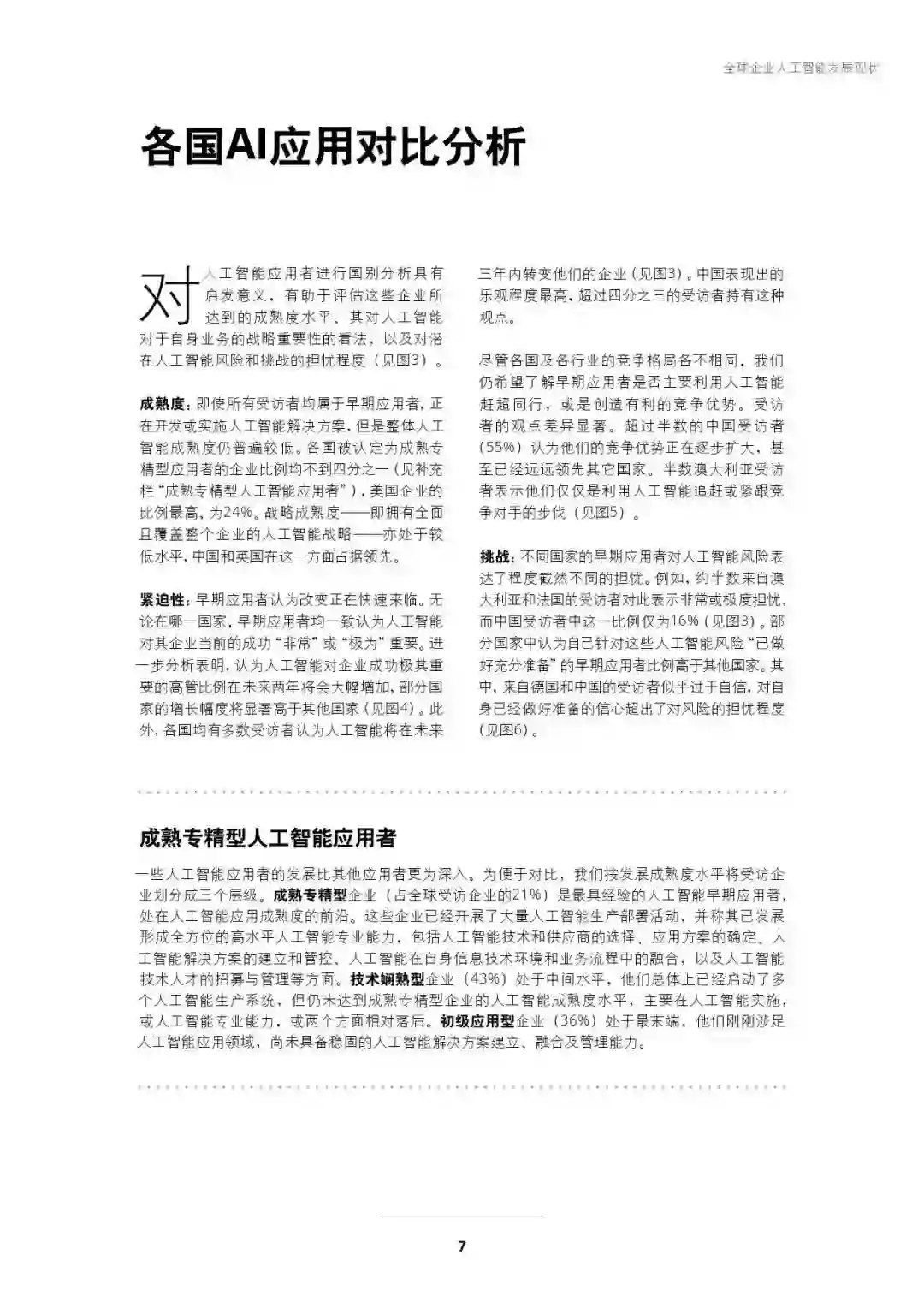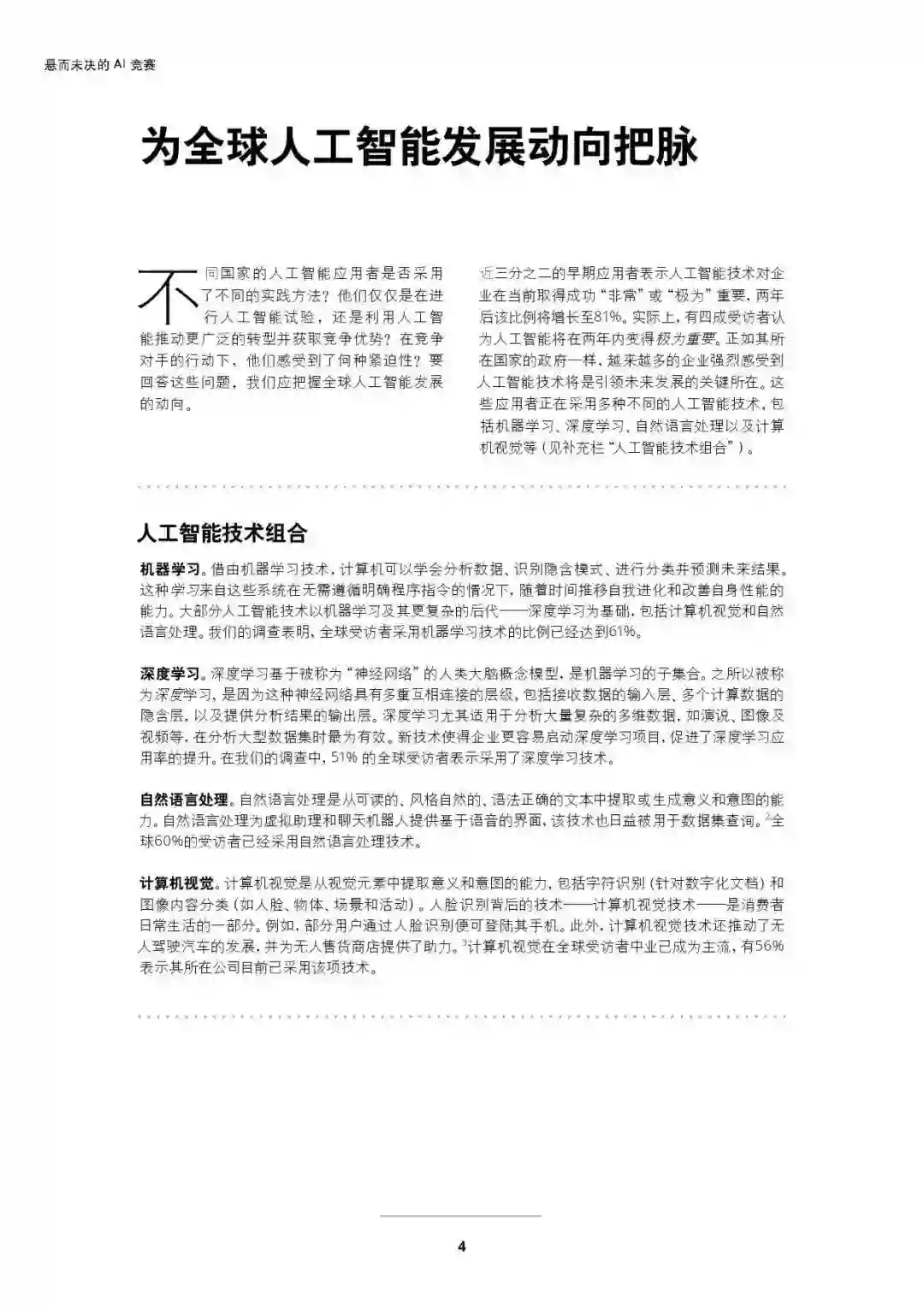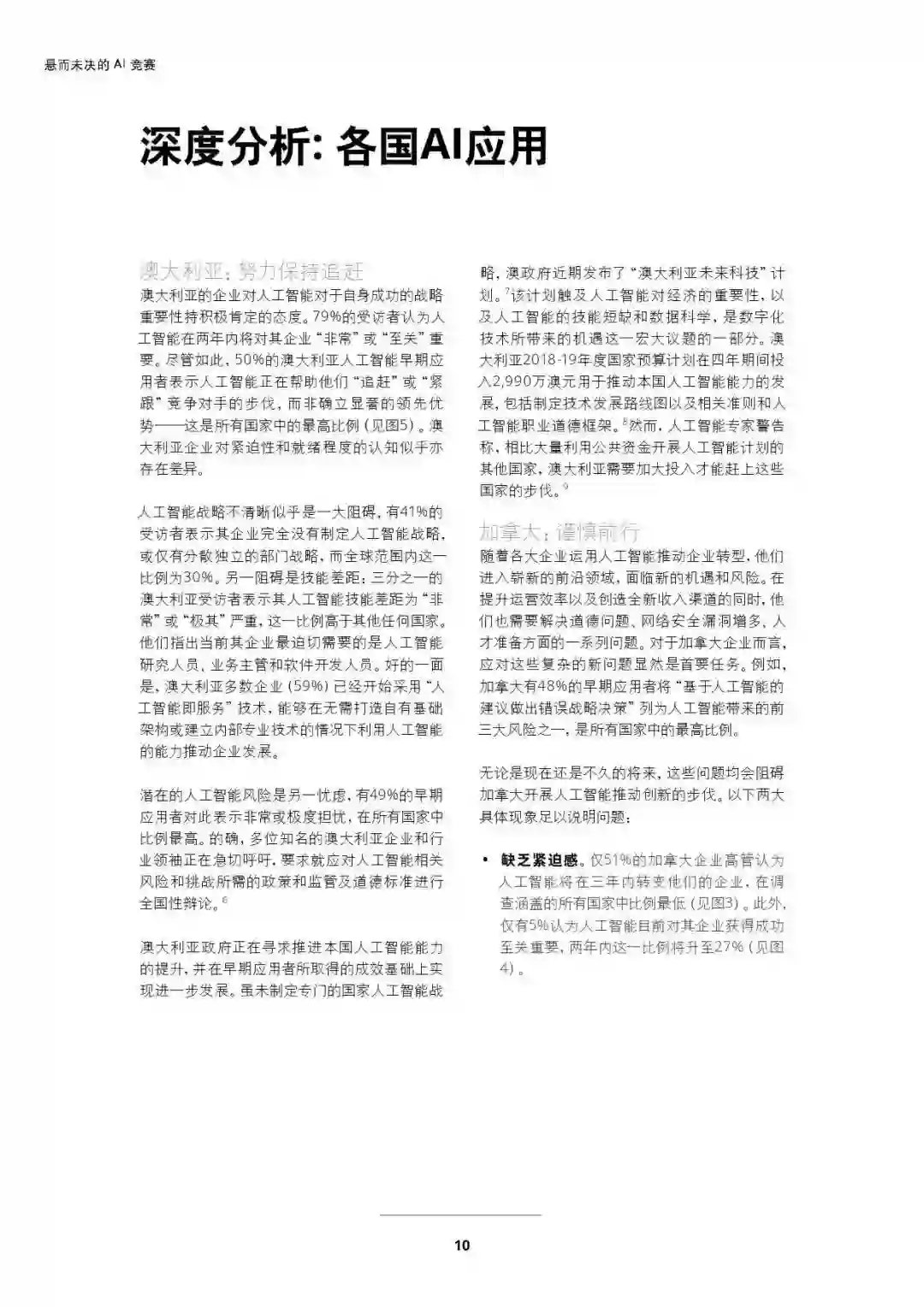 《悬而未决的AI竞赛——全球企业人工智能发展现状》由德勤洞察发布,德勤中国科技、传媒和电信行业编译。为了解全球范围内的企业在应用人工智能技术方面的情况以及所取得的成效,德勤于2018年第三季度针对早期人工智能应用企业的1900名信息技术及业务线高管开展了调查,范围涵盖七个国家:澳大利亚、加拿大、中国、德国、法国、英国以及美国。该调查重点关注了全球人工智能发展动态,以全球视角解读早期应用者,希望帮助所有企业制定更明智、更均衡的策略实现人工智能领域的独特优势。我们在深度探索七个国家的早期应用者后,发现: