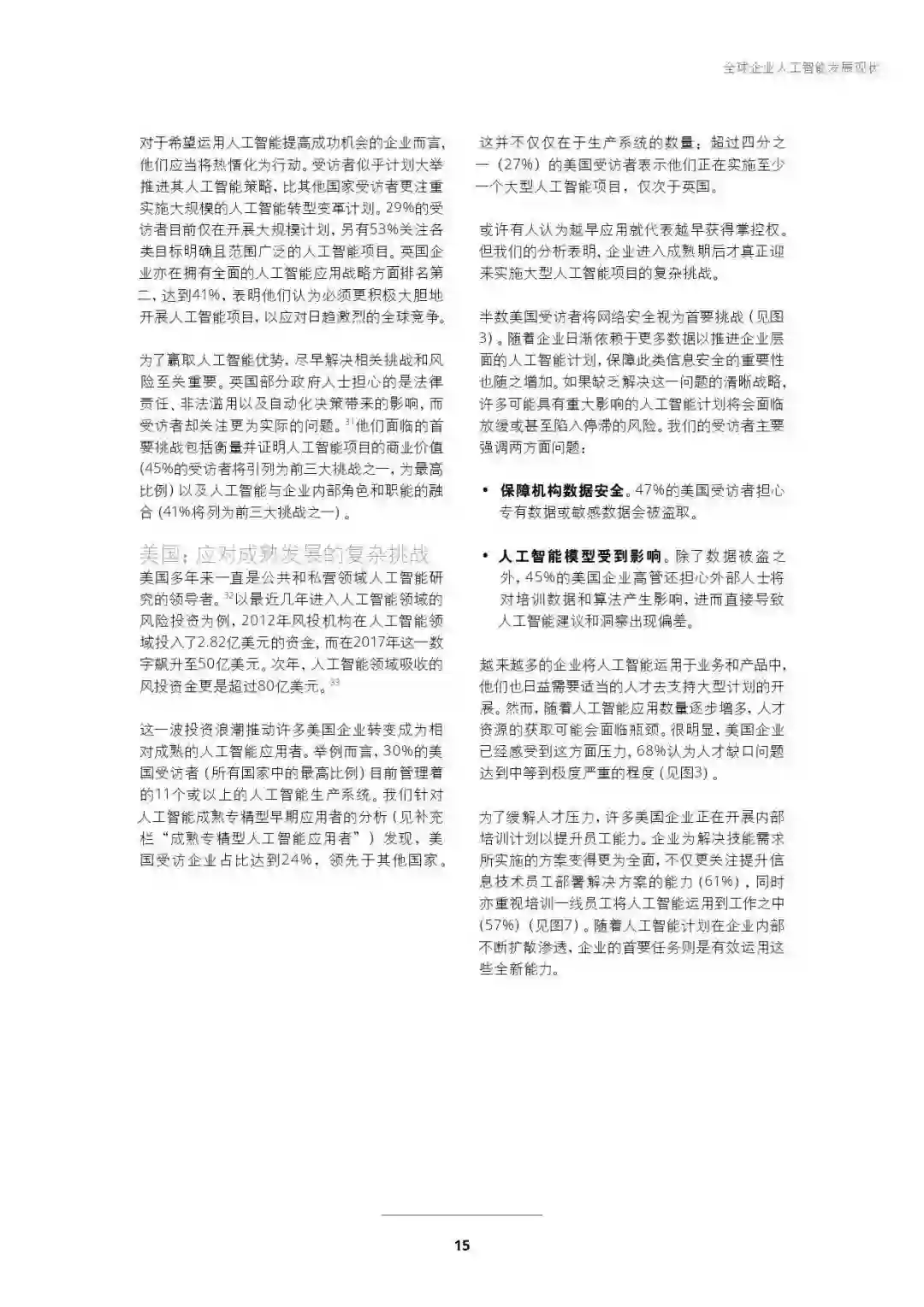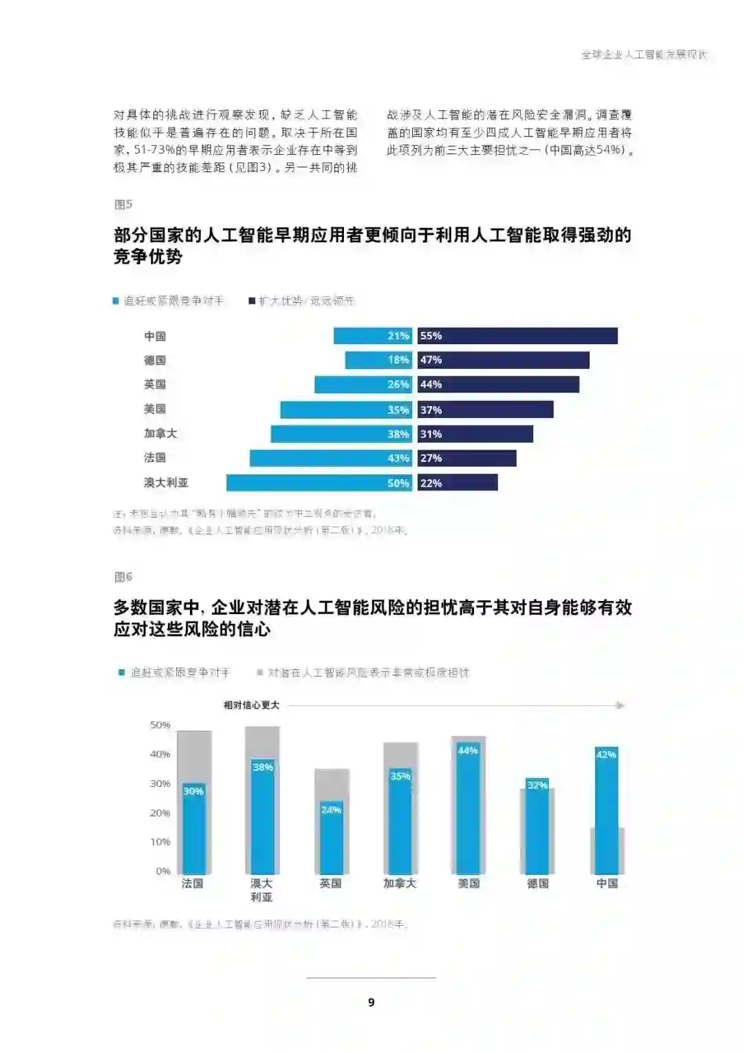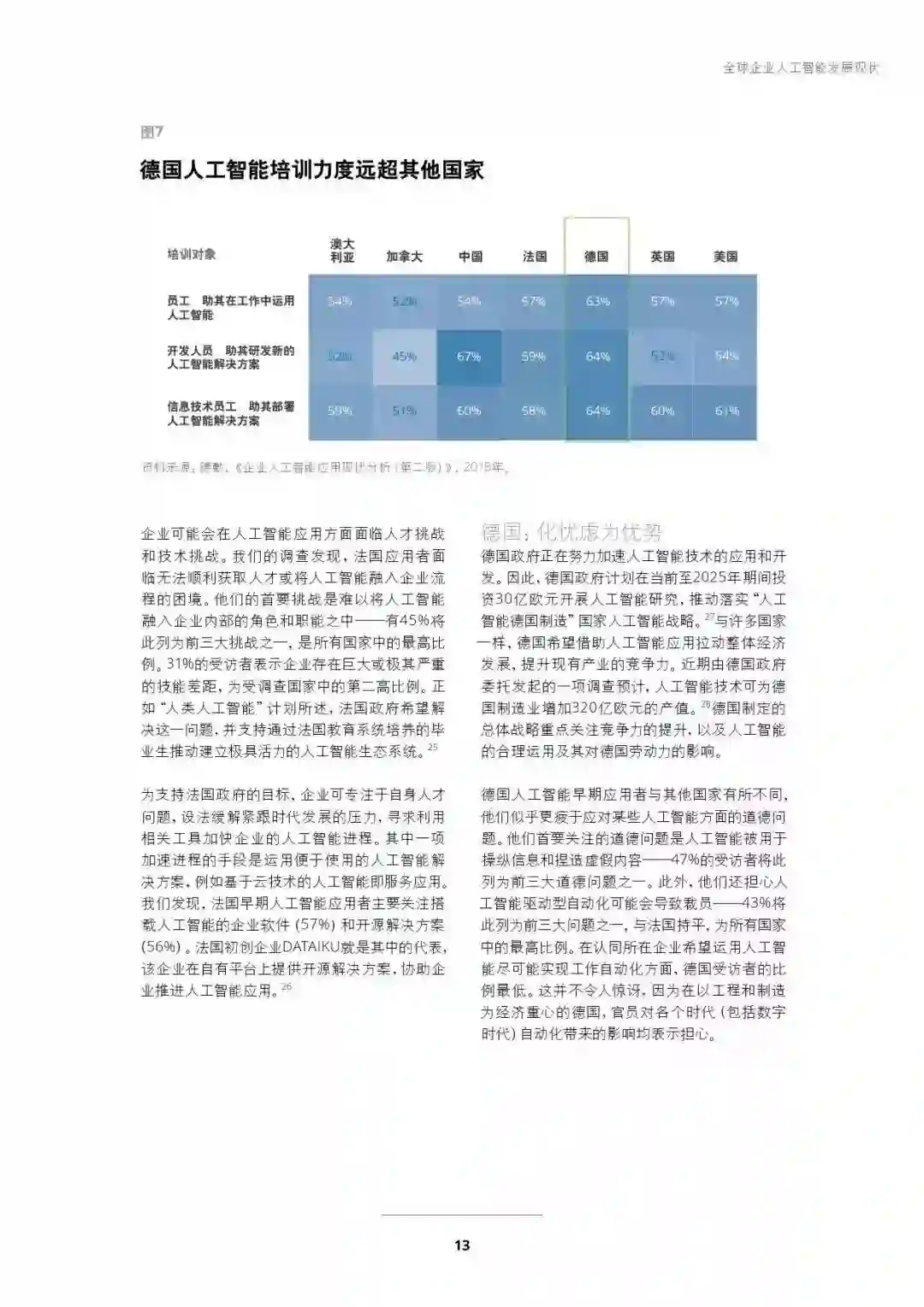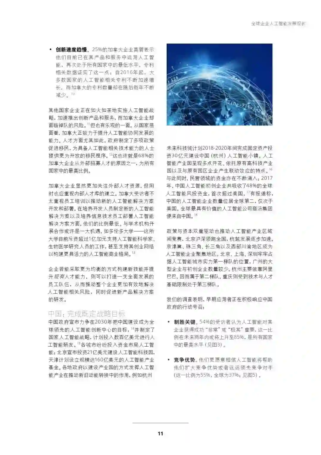 《悬而未决的AI竞赛——全球企业人工智能发展现状》由德勤洞察发布,德勤中国科技、传媒和电信行业编译。为了解全球范围内的企业在应用人工智能技术方面的情况以及所取得的成效,德勤于2018年第三季度针对早期人工智能应用企业的1900名信息技术及业务线高管开展了调查,范围涵盖七个国家:澳大利亚、加拿大、中国、德国、法国、英国以及美国。该调查重点关注了全球人工智能发展动态,以全球视角解读早期应用者,希望帮助所有企业制定更明智、更均衡的策略实现人工智能领域的独特优势。我们在深度探索七个国家的早期应用者后,发现: