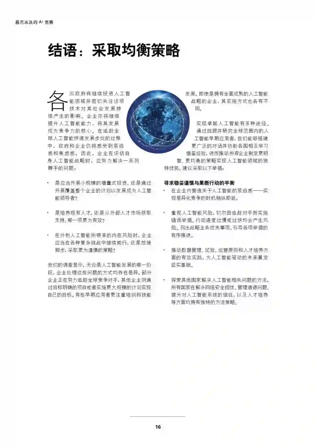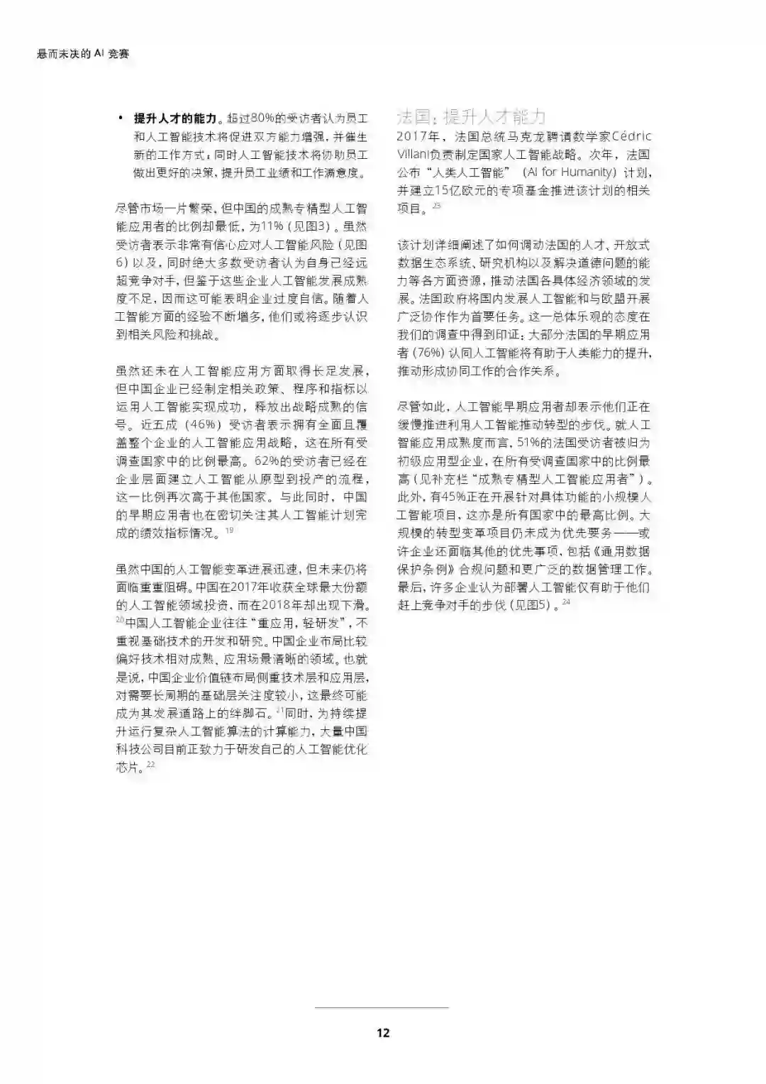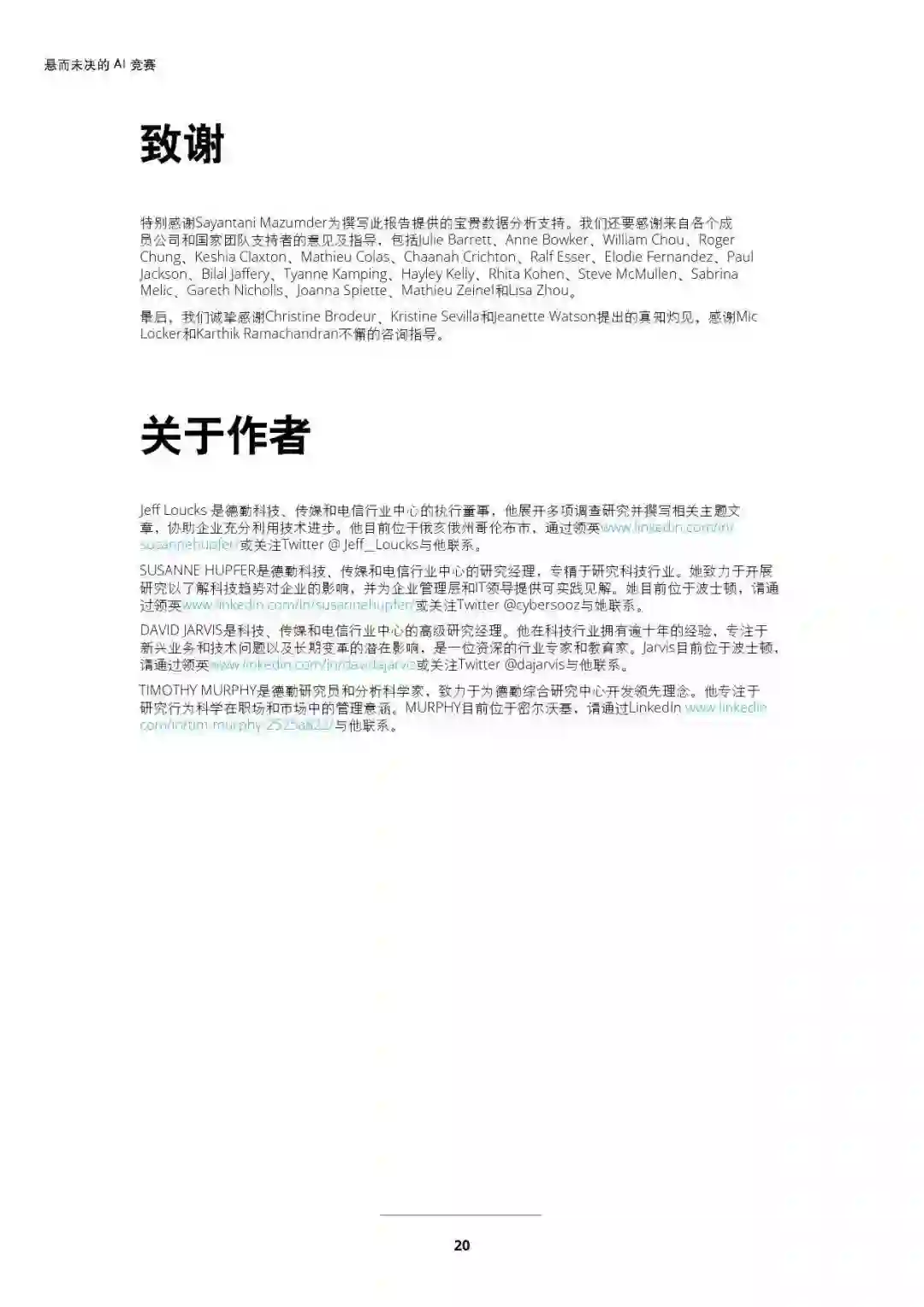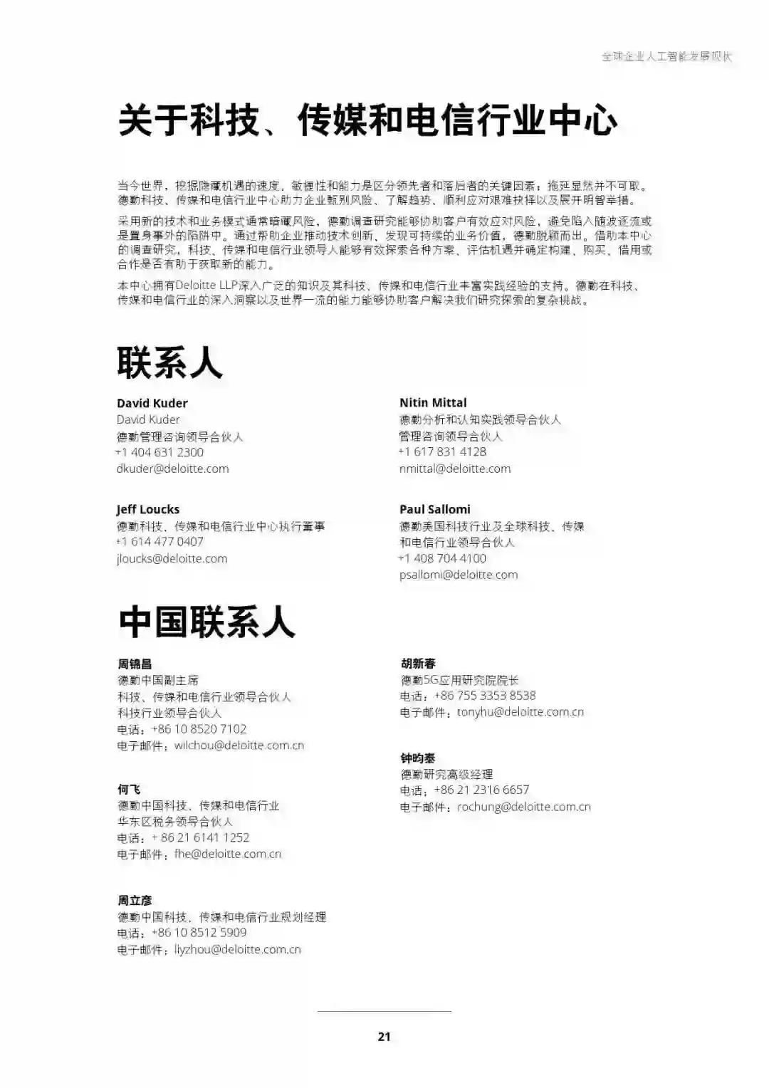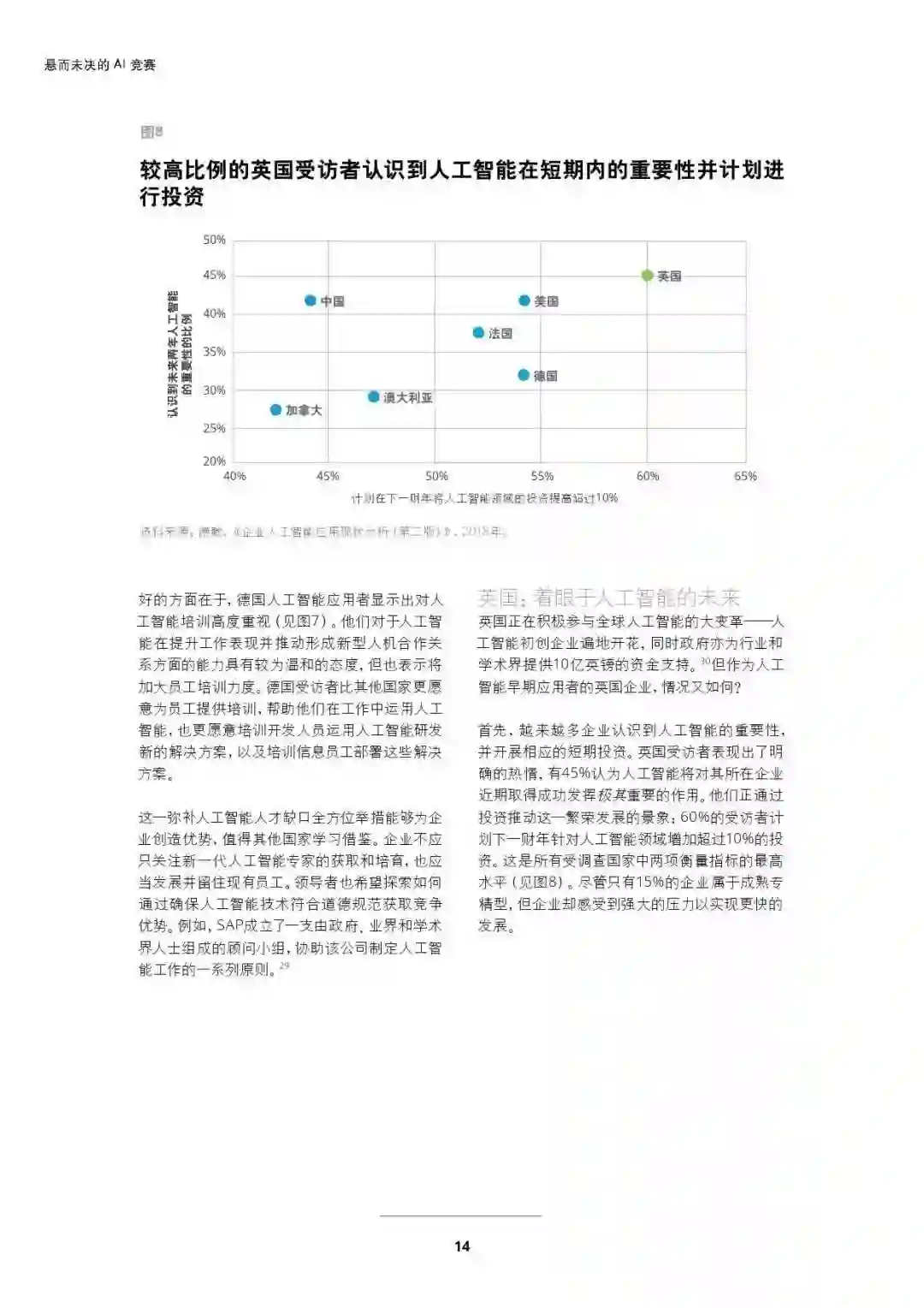 《悬而未决的AI竞赛——全球企业人工智能发展现状》由德勤洞察发布,德勤中国科技、传媒和电信行业编译。为了解全球范围内的企业在应用人工智能技术方面的情况以及所取得的成效,德勤于2018年第三季度针对早期人工智能应用企业的1900名信息技术及业务线高管开展了调查,范围涵盖七个国家:澳大利亚、加拿大、中国、德国、法国、英国以及美国。该调查重点关注了全球人工智能发展动态,以全球视角解读早期应用者,希望帮助所有企业制定更明智、更均衡的策略实现人工智能领域的独特优势。我们在深度探索七个国家的早期应用者后,发现: