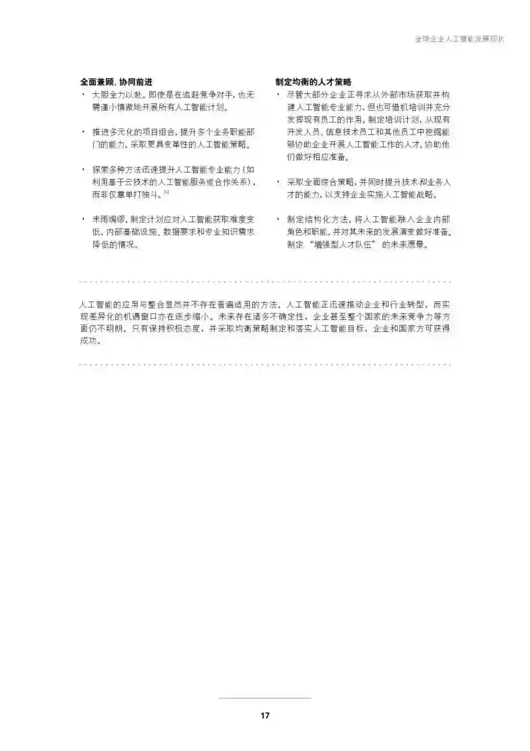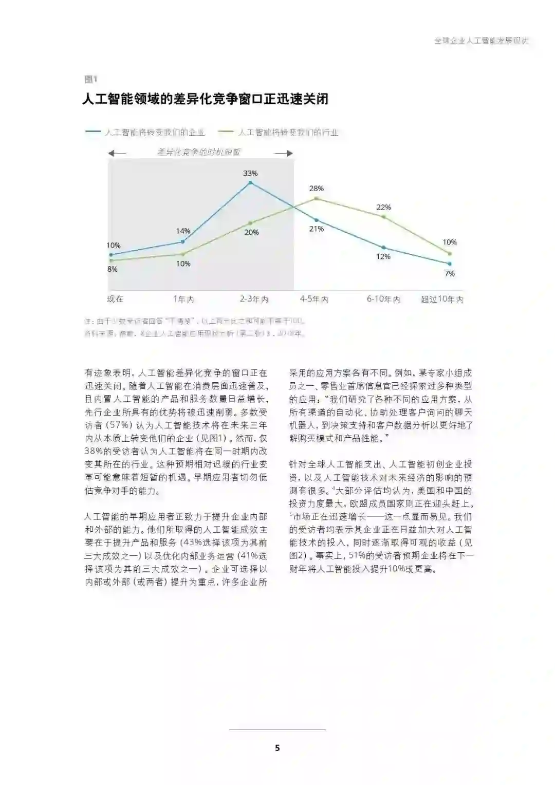 企业对人工智能重要性的认识逐步加深,包括增强竞争优势和改进工作方式。全球大部分早期应用者表示,人工智能技术对企业在当今时代取得成功尤为重要——这一观念正在逐步增长。亦有大部分早期应用者表示正在采用人工智能技术赶超竞争对手,同时人工智能赋予了其员工更加强大的能力。