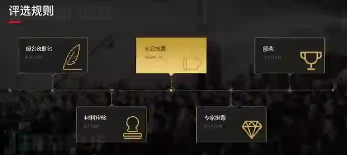 评选分为线上报名&提名,大众投票,专家投票,颁奖四个阶段。其中专家投票分为媒体评委评选和专业评委评选。