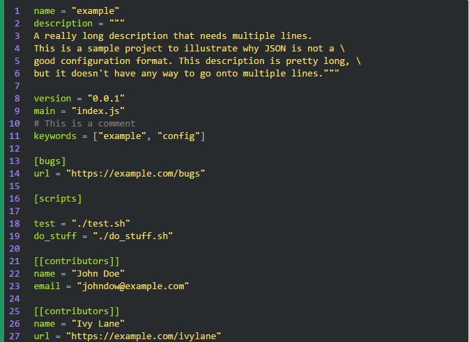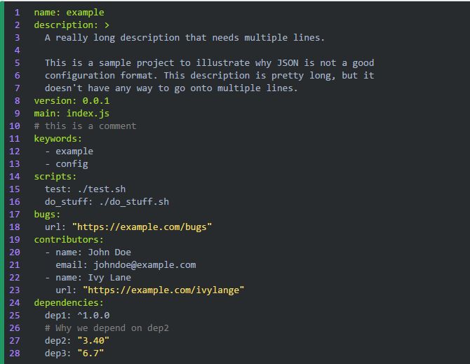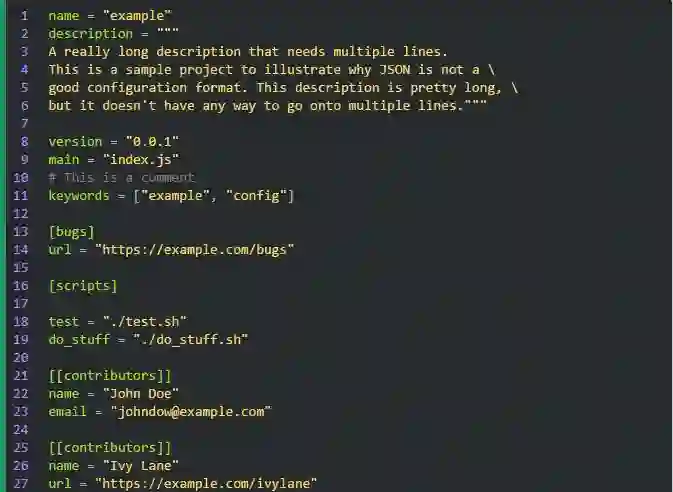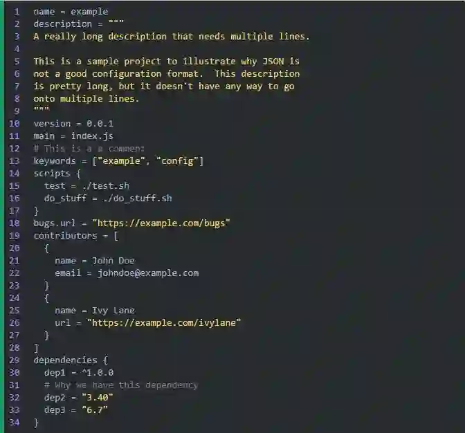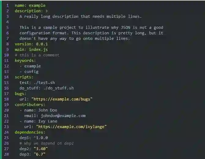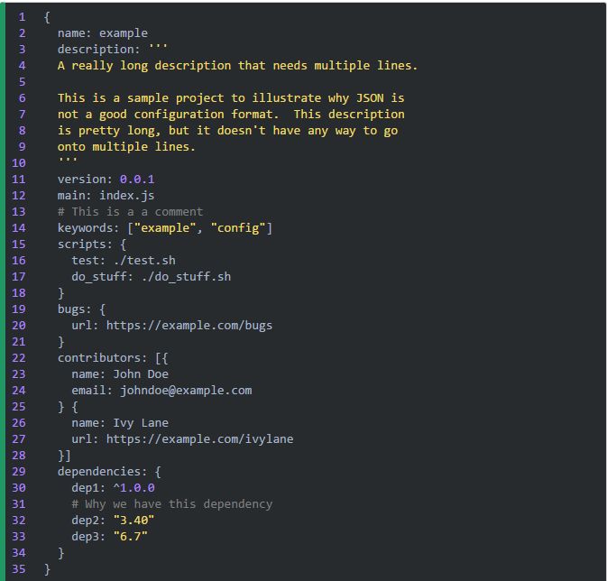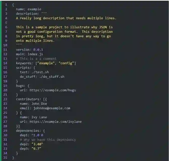 JSON 作为配置文件的另一个问题是它不支持多行字符串。如果要在字符串中使用换行,就得转义成“\n”,而且更糟糕的是,如果想在文件中写一个跨行的字符串,那是完全没办法的。若是配置文件里没有特别长的字符串的话还好。但如果配置文件里包含长字符串,比如某个项目的描述,或者 GPG 秘钥,你肯定不希望把所有行都放在同一行里并用“\n”连接起来。