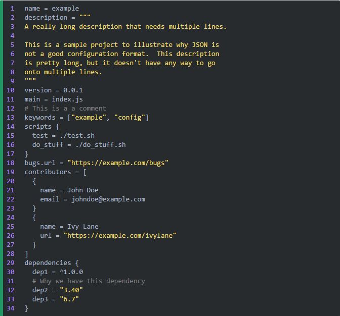 "description": "A really long description that needs multiple lines.\nThis is a sample project to illustrate why JSON is not a good configuration format. This description is pretty long, but it doesn't have any way to go onto multiple lines.",