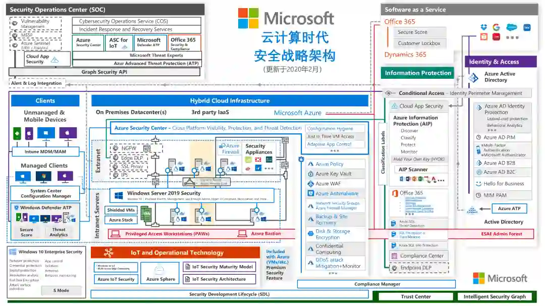 从战略上,微软将网络安全上升为核心战略方向之一;从研发投入上,微软每年在安全研发方面投入超过 10 亿美元;从技术架构上,微软具有完善的云计算安全战略架构,关注企业网络安全的各个方面,全方位捍卫企业安全: