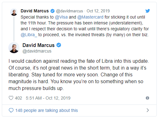作为对这一消息的回应,Libra负责人戴维·马库斯(David Marcus)承认,这个消息“在短期内看不是件好事”,不过,面对如此大的压力能够让你明白“自己真正在做一件大事”。他还确认了MasterCard和Visa退出该项目的消息,这两家支付巨头只是在等待Libra建立起合适的、明确的监管措施。