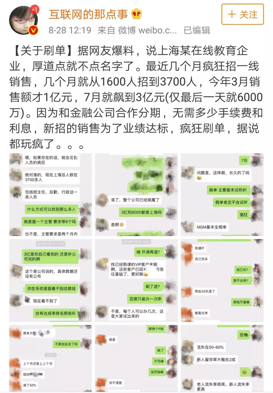 最近,有网友爆料,上海的某教育企业,为了创造亮眼的销售报表,疯狂刷单。这家企业在短短四个月疯狂招聘一线销售,团队从1600人迅速扩张到3700人。然后,通过与金融合作分期的方式 ,规避手续费和利息的方式疯狂刷单,三个月业绩暴增三倍。