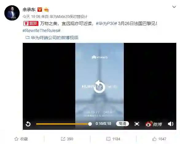 昨晚华为终端公司官微的意外偷跑被证明的确不是烟雾弹,今天上午(2月19日),华为官方以及消费者业务CEO余承东正式宣布,华为P30系列将于3月26日在法国巴黎会议中心发布。