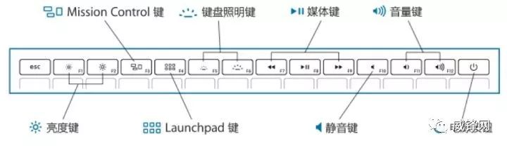 首先,在一些 Mac 键盘的顶行部分会有一些特殊功能的键盘,表示音量调节,亮度显示等: