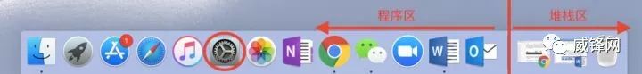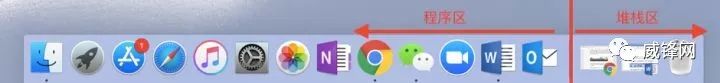 我们将 Dock 左边的区域称为程序区,也就是这边放的都是可以独立运行的程序;而右边叫做堆栈区,放的是所有需要依靠左边程序打开的文档,文件夹等。例如现在被我打开的 Chrome 浏览器,Word 文档,都是放在右边,所以左右是不能互相移动的。
