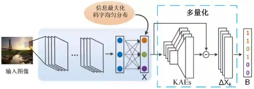 1. 针对量化信息损失大的问题,提出多量化非监督二值特征学习方法。该方法设计了深度K-自编码网络,采用多量化的方式学习数据适应的二值化过程,最小化二值特征的量化信息损失。该方法进一步引入了特征维度间竞争以获得更优的码长分配,采用更多的码字描述信息量丰富的维度,对数据进行充分的描述。
