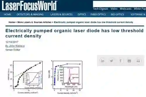 Laser Focus World的高级主编John Wallace评价该工作,“该低阈值激光器的实现意味着室温、连续激射的可行性,是有机半导体激光器获得实际应用的重要一步。”此外,该激光器极低阈值电流密度颠覆了人们对有机半导体激光的认识,表明高品质因子微腔中的有机Frankel激子的激发态性质以及相关的受激发射过程发生很大变化。开展上述物理过程的基础研究将使人们对有机半导体材料的激发态过程有更深入的理解和认识,有助于推动有机半导体的发展,促生全新型有机光电子器件的产生和广泛应用。