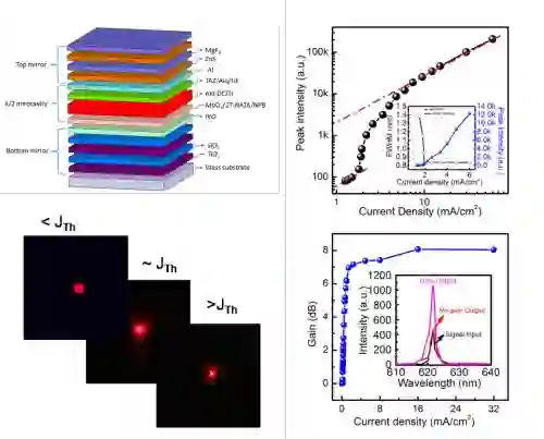 图2.电泵浦有机激光器件的阈值及光放大特性