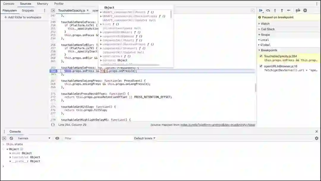 为了提供出色的调试体验,我们通过 DevTools 协议实现了对 Chrome 远程调试的支持。时至今日,React Native 还只支持在 Chrome 中运行应用的 JavaScript 代码时使用应用内代理调试。有了这种支持就能调试应用了,但 React Native 桥接器中不能同步原生调用。Hermes 对远程调试协议的支持允许开发者连接到在其设备上运行的 Hermes 引擎,并使用与生产中相同的引擎原生调试其应用程序。除了调试之外,我们还在考虑实现对 Chrome DevTools 协议的额外支持。