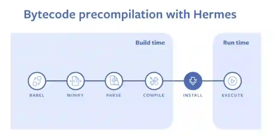 通常来说,JavaScript 引擎会在加载后才解析 JavaScript 源代码并生成字节码,JavaScript 代码需要在生成字节码后才开始执行。为了跳过这一步,Hermes 引入了一个预编译器,在移动应用构建过程中运行。这样一来优化字节码的时间可以更长,使字节码更小、效率更高。现在还可以针对整个程序做优化,例如删除重复数据和打包字符串表等。