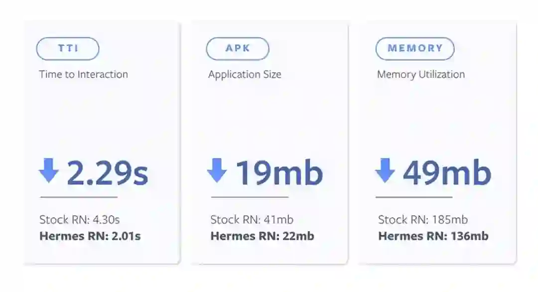 为了提高 Facebook 应用的性能,我们的团队不断改进自己的 JavaScript 代码和平台。在分析性能数据时,我们发现 JavaScript 引擎本身是影响启动性能和应用包体积的重要因素。有了这些数据,我们意识到必须在比 PC 端限制更多的移动环境中优化 JavaScript 性能。尝试了各种方案后,我们构建了一个新的 JavaScript 引擎:Hermes。它旨在提高应用性能,专注于 React Native 应用,并且在市面上那些内存较少、存储速度较慢且计算能力低下的移动设备上都有良好的表现。