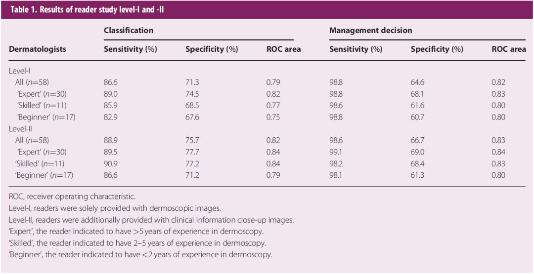 在 I 级诊断中,皮肤科医生对病变分类的敏感性和特异性的平均得分(±标准差)分别为 86.6% (±9.3%) 和 71.3% (±11.2%)。获得更多临床信息后(level-II),得分分别提升到了 88.9% (±9.6%, P = 0.19) 和 75.7% (±11.7%, P < 0.05)。相比于皮肤科医生在 I 级、 II 级的特异性与敏感性得分,CNN 的 ROC 曲线显示出更好的特异性(82.5%)。CNN 的 ROC 曲线下面积要比皮肤科医生的平均 ROC 面积(0.86 vs 0.79, P < 0.01)大。CNN 的得分接近 ISBI 2016 挑战赛的 3 大顶级算法结果。