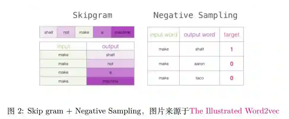 一种常见的方法为 Skip-gram + Negative Sampling。简单来说,该算法构造两个向量矩阵,一个 Embedding 矩阵,一个 Context 矩阵。利用 Skip-gram 来构建训练正例,使用 Negative sampling来构建负例,如图2。