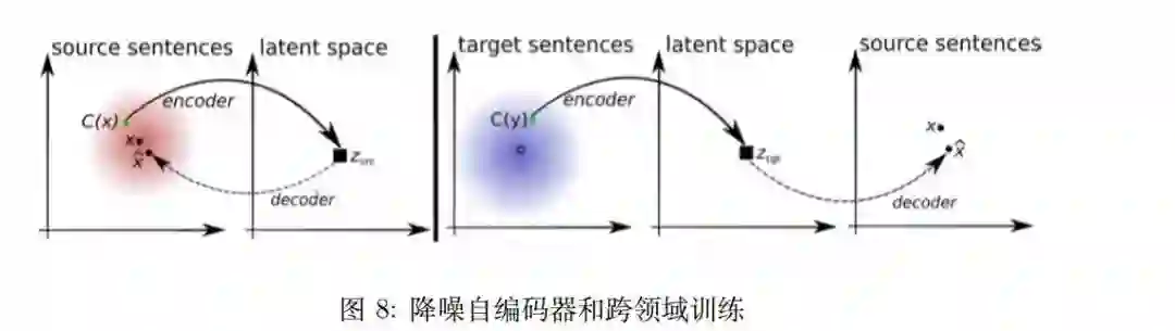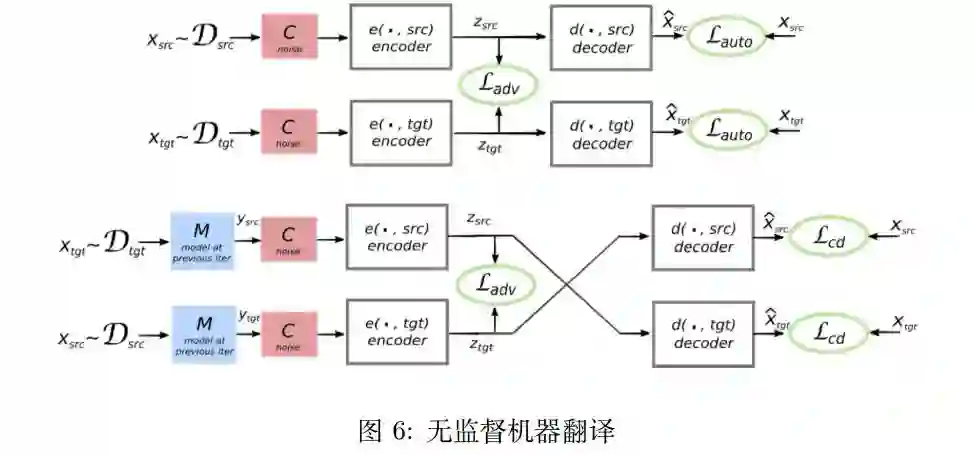 基于上述工作, [Lample et al., 2017] 在没有对齐语料的情况下,仅使用单语语料来完成无监督机器翻译。该方法可以很好地泛化到其他语言,并且为有监督的方法提供了性能下限。其 baseline模型如 [Johnson et al., 2017]。首先使用上述无监督方法得到的翻译词典来初始化翻译模型。接着使用降噪自编码器训练,跨领域训练和对抗训练得到最终模型,如图6。