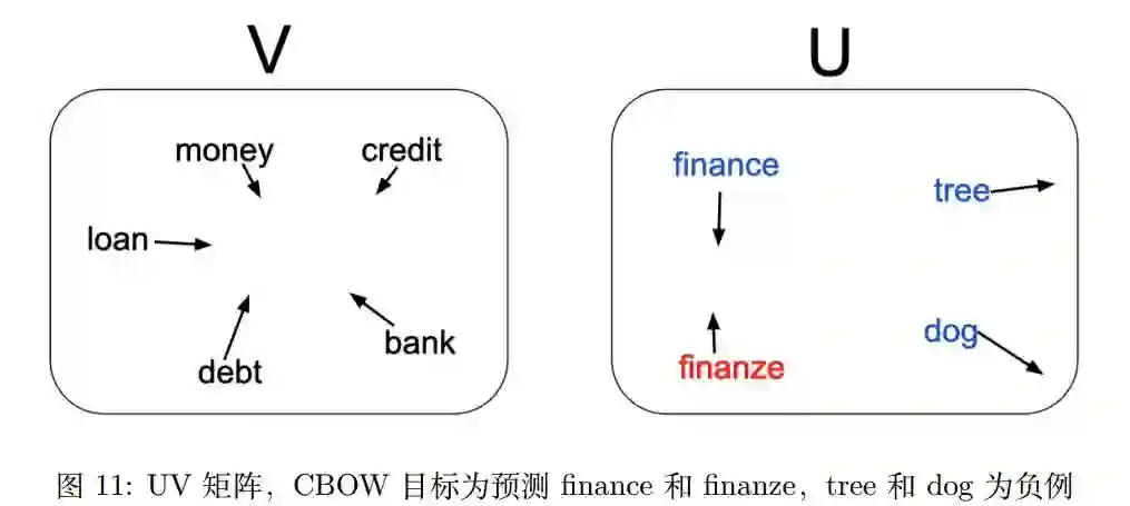 [Duong et al., 2016] 提出的方法与上述方法类似,区别在于,只在使用 CBOW 算法学习词向量的时候替换目标词语。而非预先利用词典构造多语语料库。在学习的时候会同时预测源语言目标词语及其对应的替换后的目标词语作为联合训练目标。除此以外,之前的方法都没有处理一词多义的问题,例如 bank 可能有两种意思:river bank 或者 fnancial bank,对应在意大利语中的翻译就是 sponda 和 banca。因此作者利用上下文词汇表示结合中心词汇表示的方式来选择最合适的翻译词语。通常来说,在 CBOW 算法中,会有两个矩阵,一个 context 矩阵 V ,一个 word 矩阵 U。作者指出,使用这种方式训练的词向量, V 矩阵更倾向于单语表示, U 矩阵更倾向于双语表示。其过程如图11。