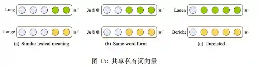 [Liu et al., 2019] 利用一种共享-私有(Shared-Private)词向量来建模源语言词向量和目标语言词向量之间的关系,以及减少模型参数量。其核心想法在于,词向量的一部分是语言无关的,是共享的,另一部分是语言相关的,是私有的。并提出了三种共享关系,相似词语表示(