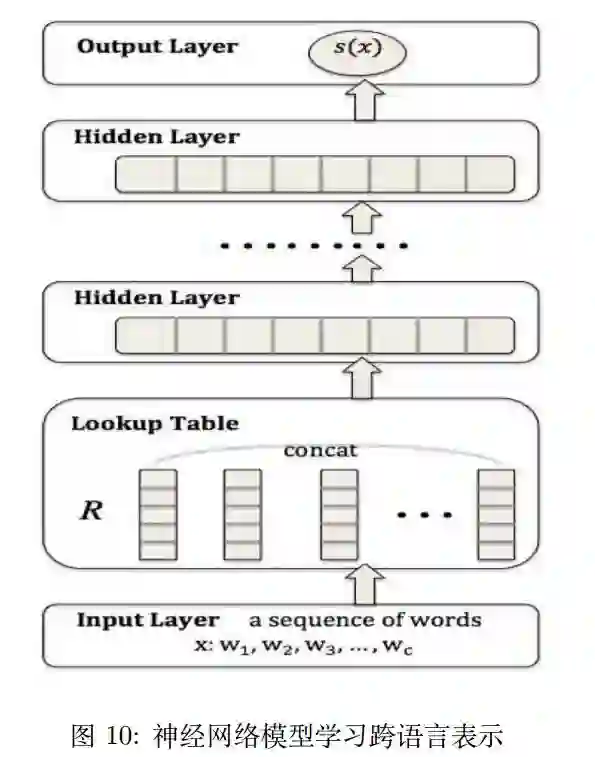 [Xiao and Guo, 2014] 利用 Wikitionary 作为两种语言之间的桥梁,构建了统一的双语词典。首先构建源语言词典,然后利用 Wikitionary 找到其所有的翻译。删除满足以下条件的翻译:一个源语言词语有多个目标语言翻译、一个目标语言词语有多个源语言翻译、源语言的目标语言翻译词语在目标语言数据集中没有出现。经过以上三步处理,可以得到一个一对一的双语词典。将源语言和目标语言建立统一的双语词表 V ,利用构建好的双语词典,在词表 V 中属于词典映射关系的两个词语将会被映射到相同的词向量空间。然后利用神经网络来学习词向量表示。其任务是一个二分类问题,输入是一个子句,通过替换正例中的词语来构建负例。最终会学习到统一双语词典的向量表示,以此作为双语空间的桥梁。其模型如图10。这种方法对齐词语有同一表示。