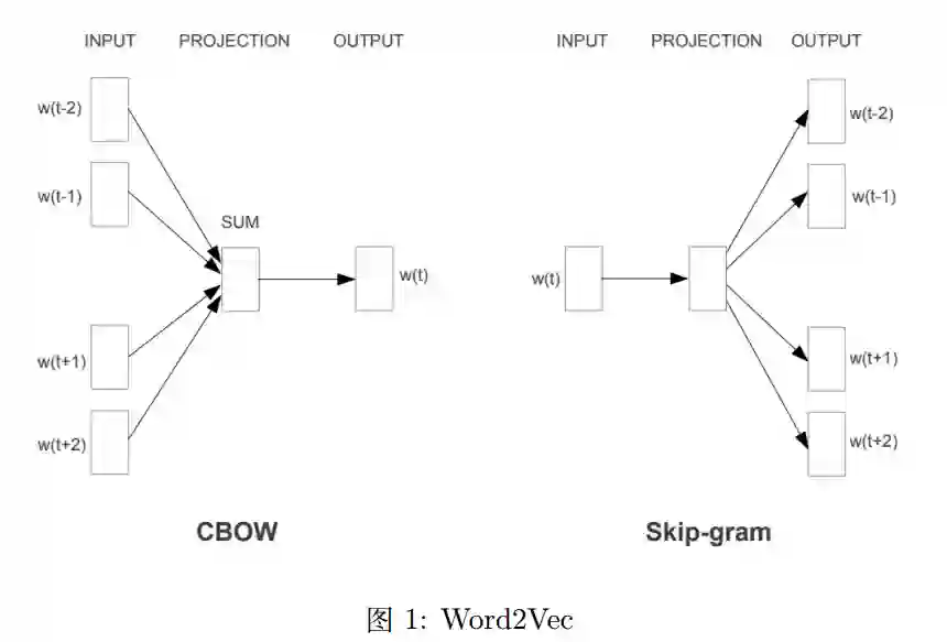 常用的单语词向量有 Word2Vec, GloVe, fastText 等。下面主要介绍一下 Word2Vec[Mikolovet al., 2013c,a],Word2Vec 基于分布式假设(Distributional hypothesis):拥有相似上下文(context)的词语通常拥有相似的含义。其算法分为 Skip-gram 和 Continuous Bag of Words(CBOW)。Skipgram 根据中心词预测周围的词, CBOW 根据周围的词预测中心的词语,如图1。
