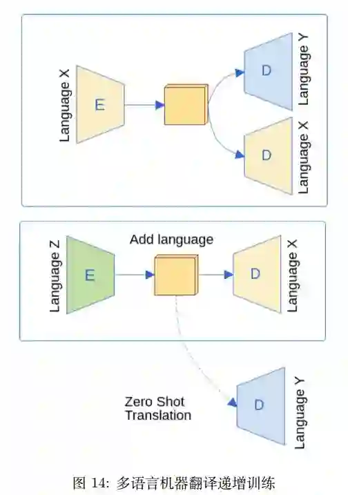 [Pires et al., 2019] 指出 [Johnson et al., 2017, Escolano et al., 2019] 的问题在于当语言的词表有显著的不同时,例如中文,词表会变得很大。因此提出了一种方法,每一种语言有自己的特定的编码器和解码器,编码器和解码器之间不共享参数。对于一个翻译对 X-Y,会完成自编码任务(X-X, Y-Y)和翻译任务(X-Y, Y-X),同时会要求编码器得到的两种表示相近。新来一种语言以后 Z,假设目前有 Z-X 的平行语料,只需要添加 Z 语言的编码器,然后固定住 X 语言的解码器参数来进行训练,这个过程只更新 Z 编码器的参数。如图14。