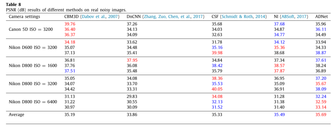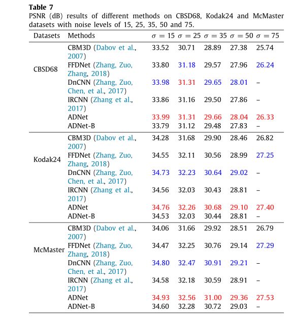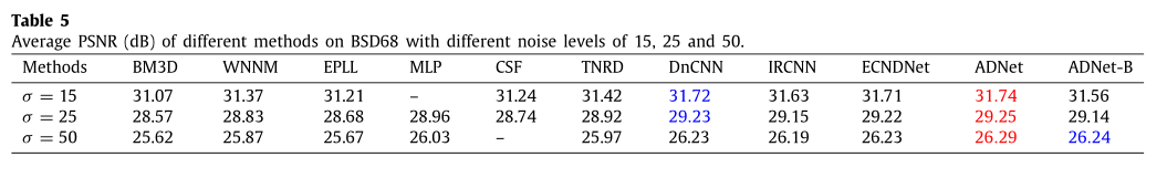 4.不同方法在BSD68数据库上对于15,25和50的噪声级别的平均PSNR (dB)