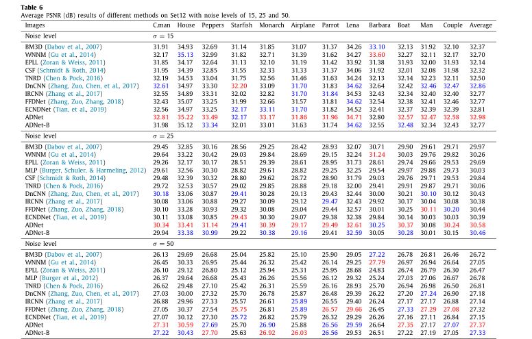 5.不同方法在Set12数据库上对于15,25和50的噪声级别的平均PSNR (dB)
