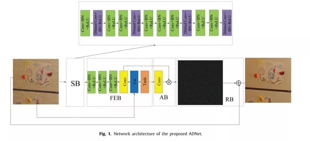 受这个启发,我们提出一个attention-guided denoising CNN (ADNet)。ADNet主要利用四个模块:一个稀疏块(SB),一个特征增强块(FEB), 一个注意力机制(AB)和一个重构块(RB)来进行图像去噪。