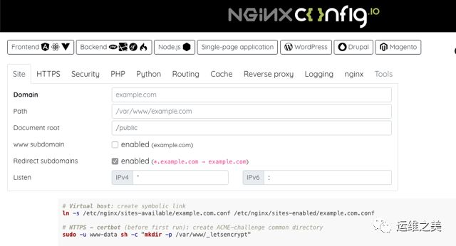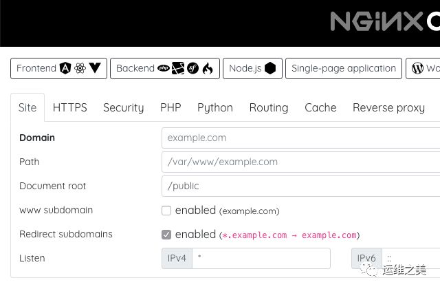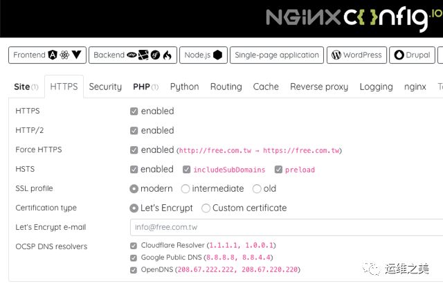 依照 NGINXConfig 说明,这个工具可以设定的项目包括网站基本选项、HTTPS、安全相关选项、PHP、Python、Routing、Cache、Reverse Proxy、Logging 等等。 NGINXConfig 已经内建几种常用的架站项目,例如:前后端、Node.js、单页面应用程序、WordPress、Drupal 和 Magento,点选后可针对该项需求先启用特定的配置选项。