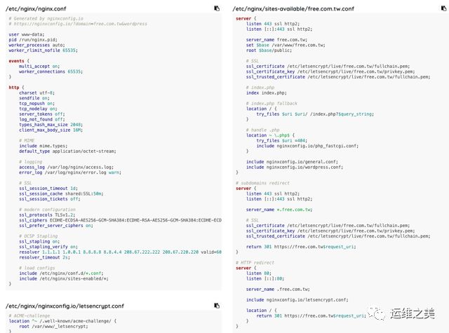 最后,将 .conf 配置文件复制、粘贴回自己 Nginx 服务器对应的路径,重新启动 Nginx 就能够完成套用修改。当然细节部分我就不在文章里多做阐述,本文主要是想推荐 NGINXConfig 这款 Nginx 配置文件生成器,至于要怎么样安装、搭建 Nginx 服务器可参考公众号上其它文章。