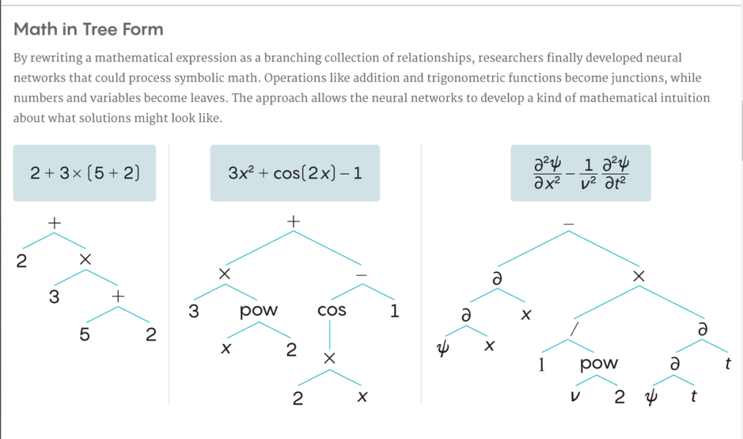 其中,运算符号例如加减乘除成为了树状图的枝,而表达式里的参数(变量和数字) 则变成了叶子。通过转化成树状图, 这能让复杂的数学表达式转化成树状图层层嵌套的简单运算中,从而可以让神经网络识别和运算想应的简化式子,并得到最终的精确结果。