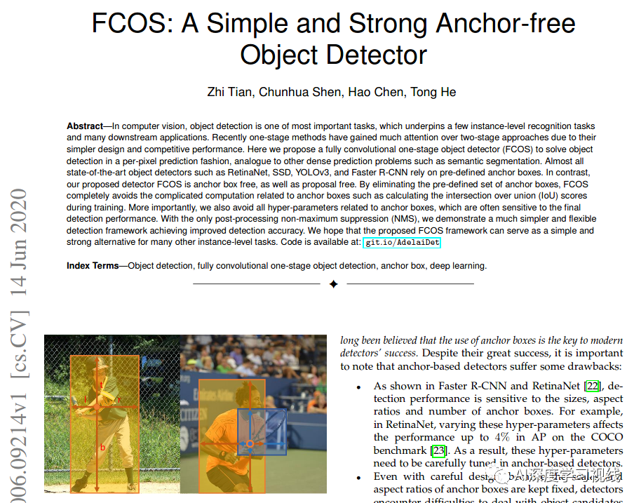 几乎所有最新的目标检测器(例如RetinaNet,SSD,YOLOv3和Faster R-CNN)都依赖于预定义的anchor。相反,我们提出的探测器FCOS不含anchor,也不含proposal。