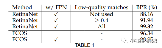 可以看出FCOS与anchor_based的RetinaNet的BPR已经很接近了。