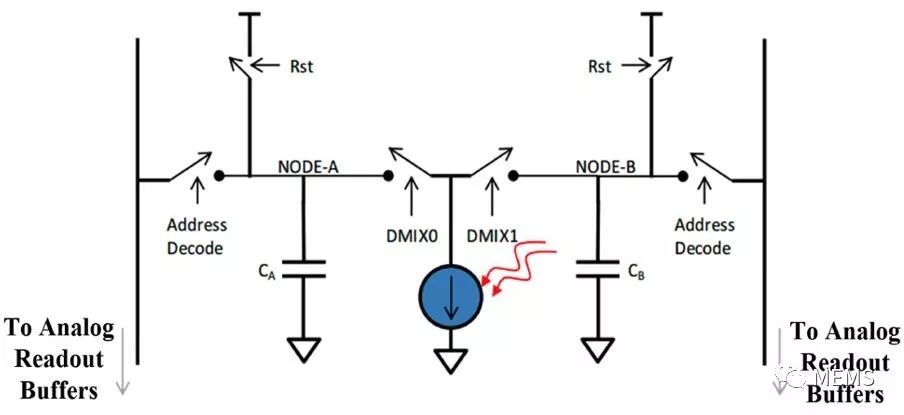 上图显示了每个像素中包括两个电荷存储电容器的CMOS图像传感器,切换两个电荷存储电容器的连接以记录入射光