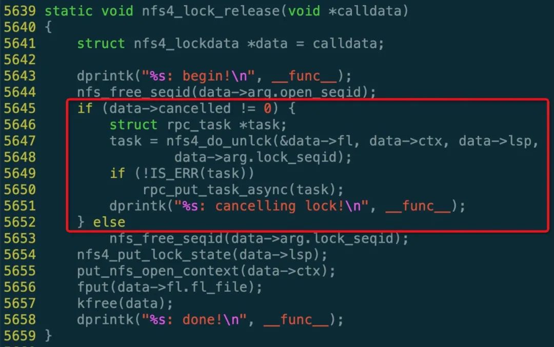 实现可知,当ret < 0时,表明获取锁过程被信号中断,并使用 struct nfs4_lockdata 的 cancelled 成员记录。继续查看rpc_task完成后释放时的回调函数