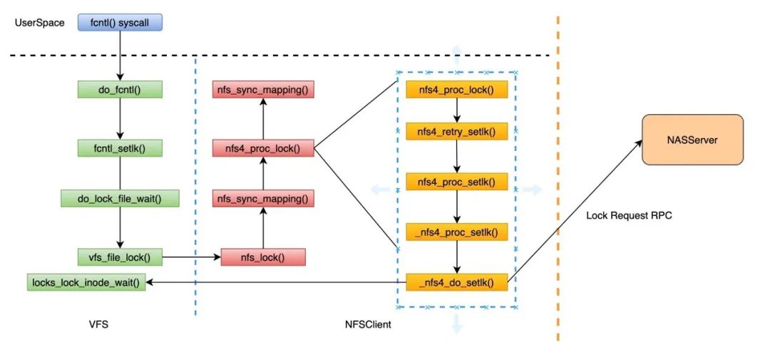 系统调用管理NFS文件锁,下面是NAS使用NFSv4挂载时获取文件锁的调用过程: