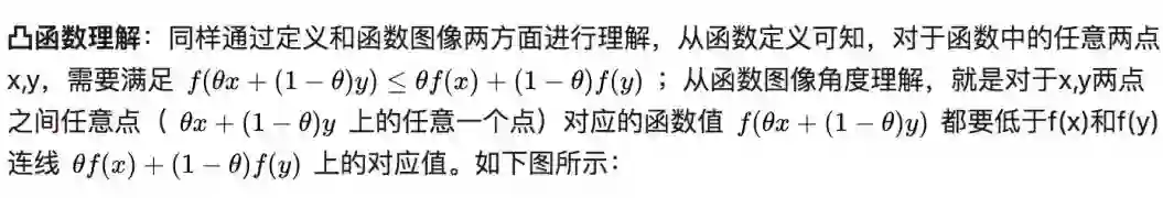 凸集的理解:对凸集的理解,我们可以分别从理论定义的角度和函数图像的角度两方面理解。从定义上讲,对于集合 C 中的任意两个元素 x 和 y,需要满足 αx + (1−α)y 的值也需要在集合 C 中;从函数图像角度讲,这个定义中的式子含义是,x、y 两点连线上的任意一个点都需要属于集合 C,如下图所示,任何证明集合是凸集的方法都可以通过定义和函数图像两方面进行。