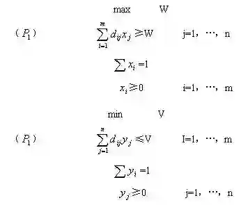 一般若D=(d1,d2,……,dm),S=(s1,s2,……,sn),支付矩阵F=(dij)mxn已知,那么对策G={D,S,F}的线性规划问题为: