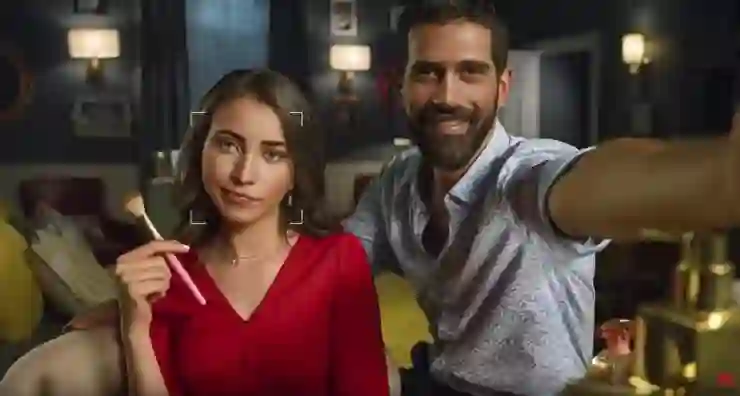 在视频中,有一组场景是男主女主(也就是视频中的模特)自拍合影,男主手持自拍设备,女主手持毛刷,画面焦点在女主脸上,显出女主的妆容格外精致,就像是后期处理过的一样。基于这一场景与整个视频的衔接关系,所有观看视频的人,都会理所当然地认为,这是华为 Note 3/3i 拍摄出来的效果。
