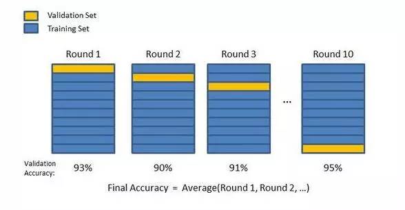 K层交叉检验的例子,在每一轮使用不同的数据进行测试(蓝色为训练数据、黄色为测试数据),方框下为每一轮的验证精度。最终的验证精度是10轮测试的平均数。图片来源: GitHub 。