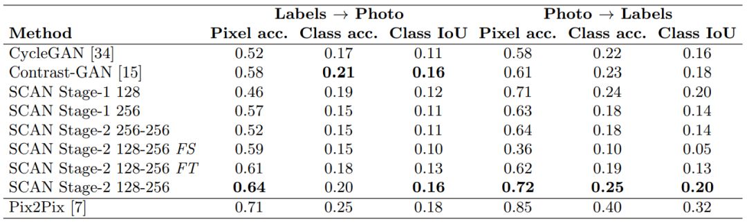 图 3 展示了在 512x512 分辨率下,标签图转换成照片的直观结果。可以看到,与 CycleGAN 相比,本文提出的 SCAN 能够生成更具真实感的照片。