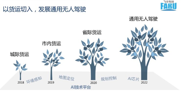 按照飞步内部的规划,这家公司要在 2018 年实现城际货运无人驾驶,连接不同城市的仓库,运输里程在 200 公里左右;到 2019 年,要实现市内货运无人驾驶,环境更加复杂多样;到 2020 年,将会着重解决省际货运无人驾驶的技术难题,进行跨省运输,里程超过 800 公里;最终到 2022 年,飞步希望实现的是通用无人驾驶——全场景 L4 级别。