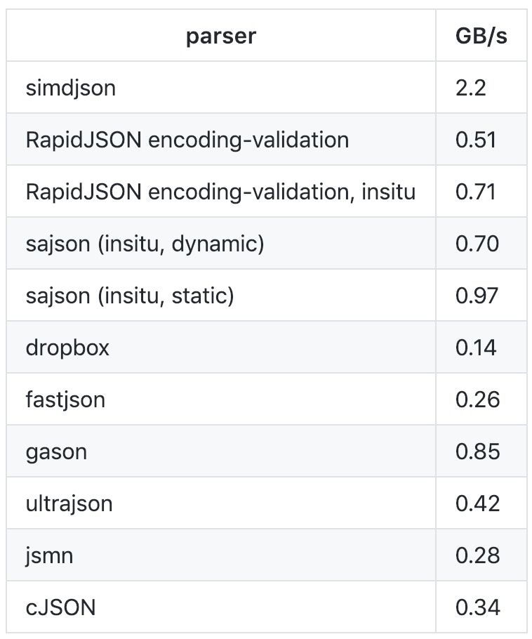 相比最先进的解析器(如 RapidJSON),我们可能使用四分之一或更少的指令,也只有 sajson 的一半。据我们所知,simdjson 是第一个在商用处理器上以每秒千兆字节速度运行的完全验证 JSON 解析器。