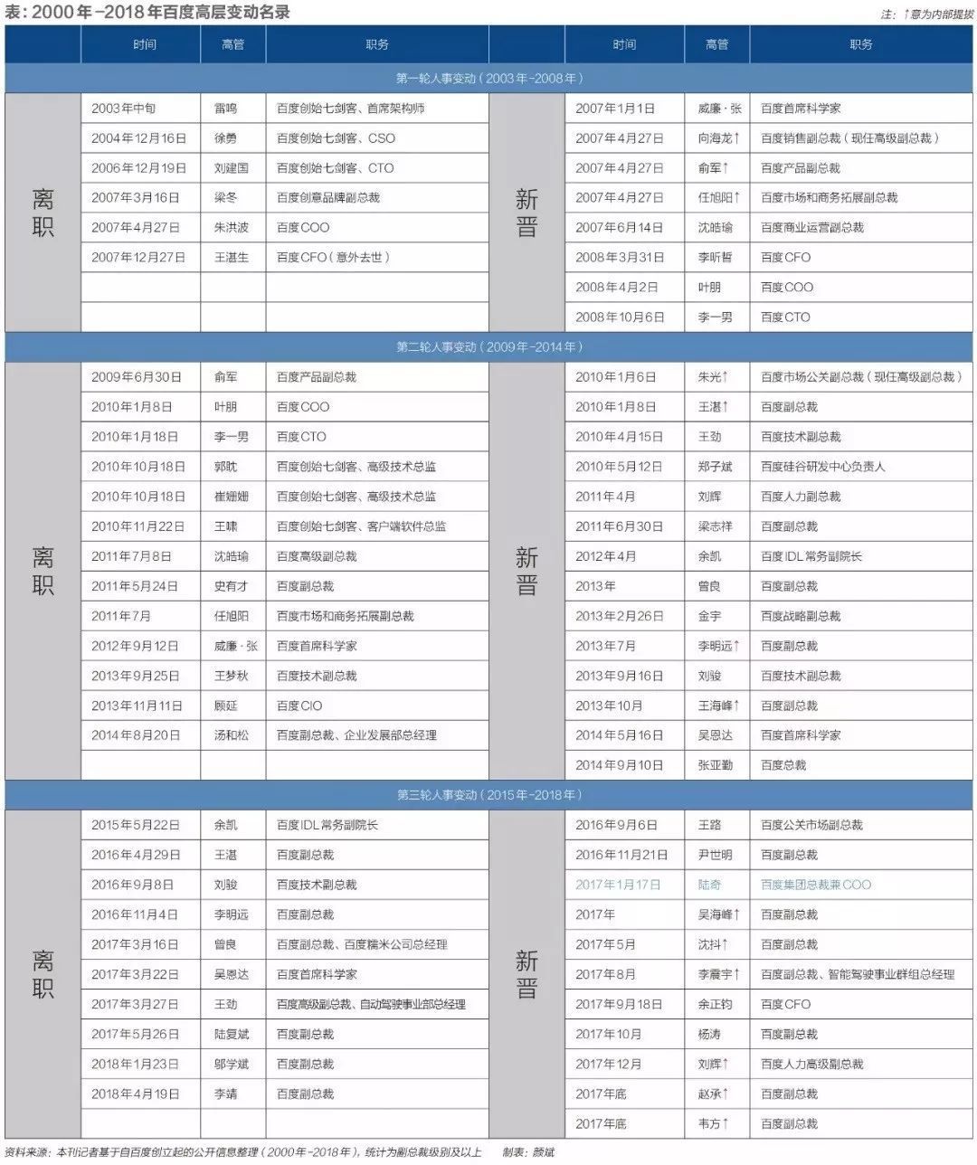 2017 年 1 月,陆奇入职后,百度多项业务被重组调整、并经历吴恩达和王劲等多名高管离职。